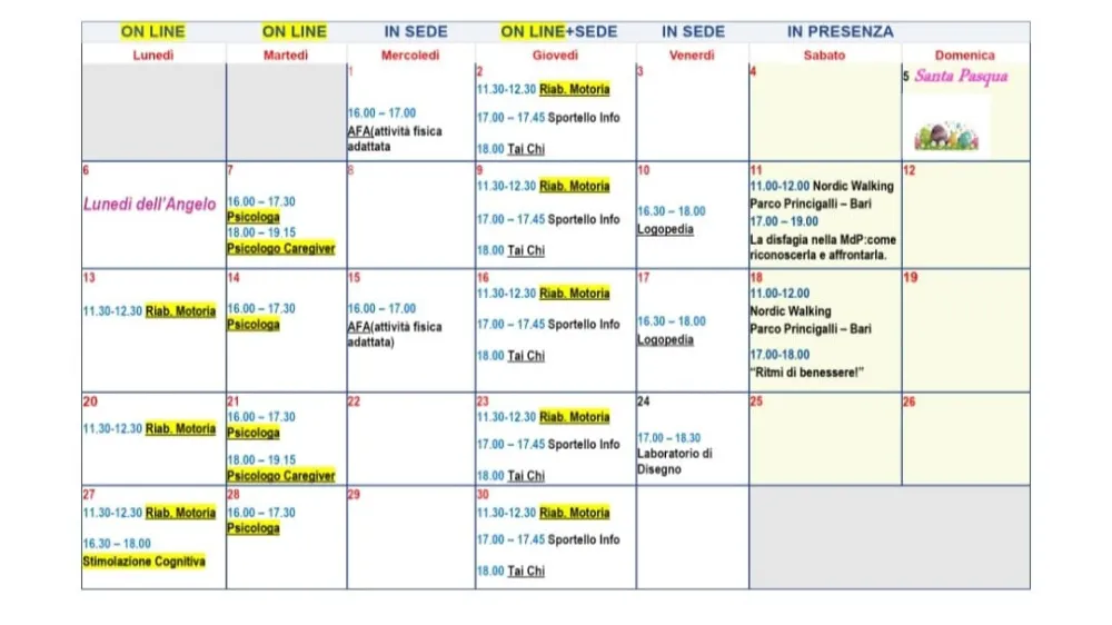 Nel programma, oltre alle attività continuative, troverete i due appuntamenti all'aperto per la pratica del Nordic Walking, una delle attività complementari più idonee a contrastare alcuni "inconvenienti" del Parkinson, con l'istuttrice Nicoletta Grandolfo;