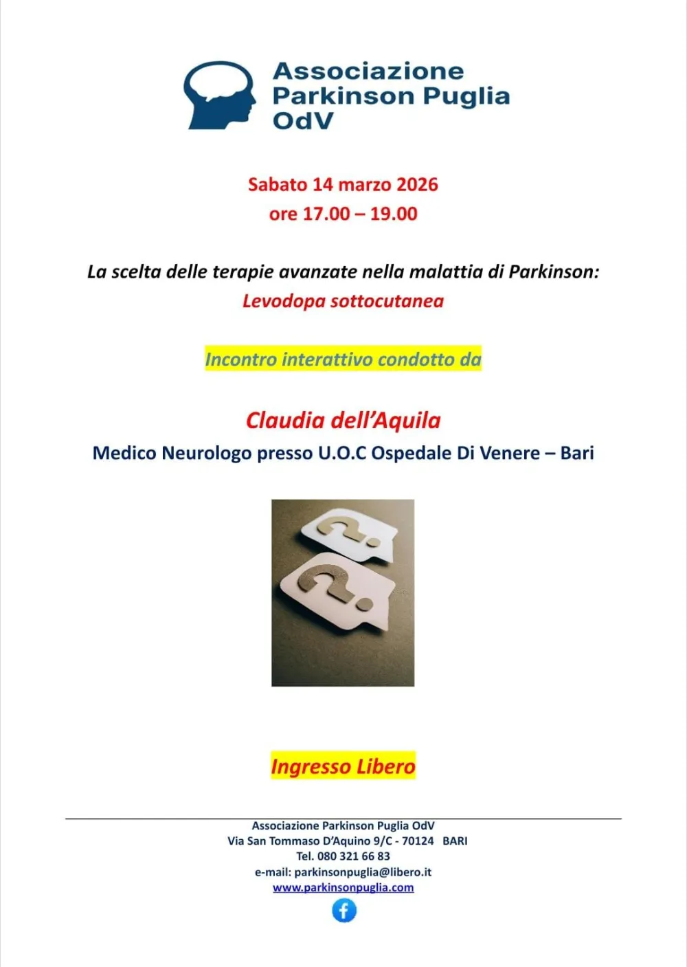 L'appuntamento con lo Specialista di sabato 14 marzo sarà dedicato alla più recente terapia di somministrazione della levodopa e sarà condotto dalla dott. Claudia dell'Aquila, neurologa parkinsonologa presso l'UOC Neurologia, ospedale Di Venere, Bari.